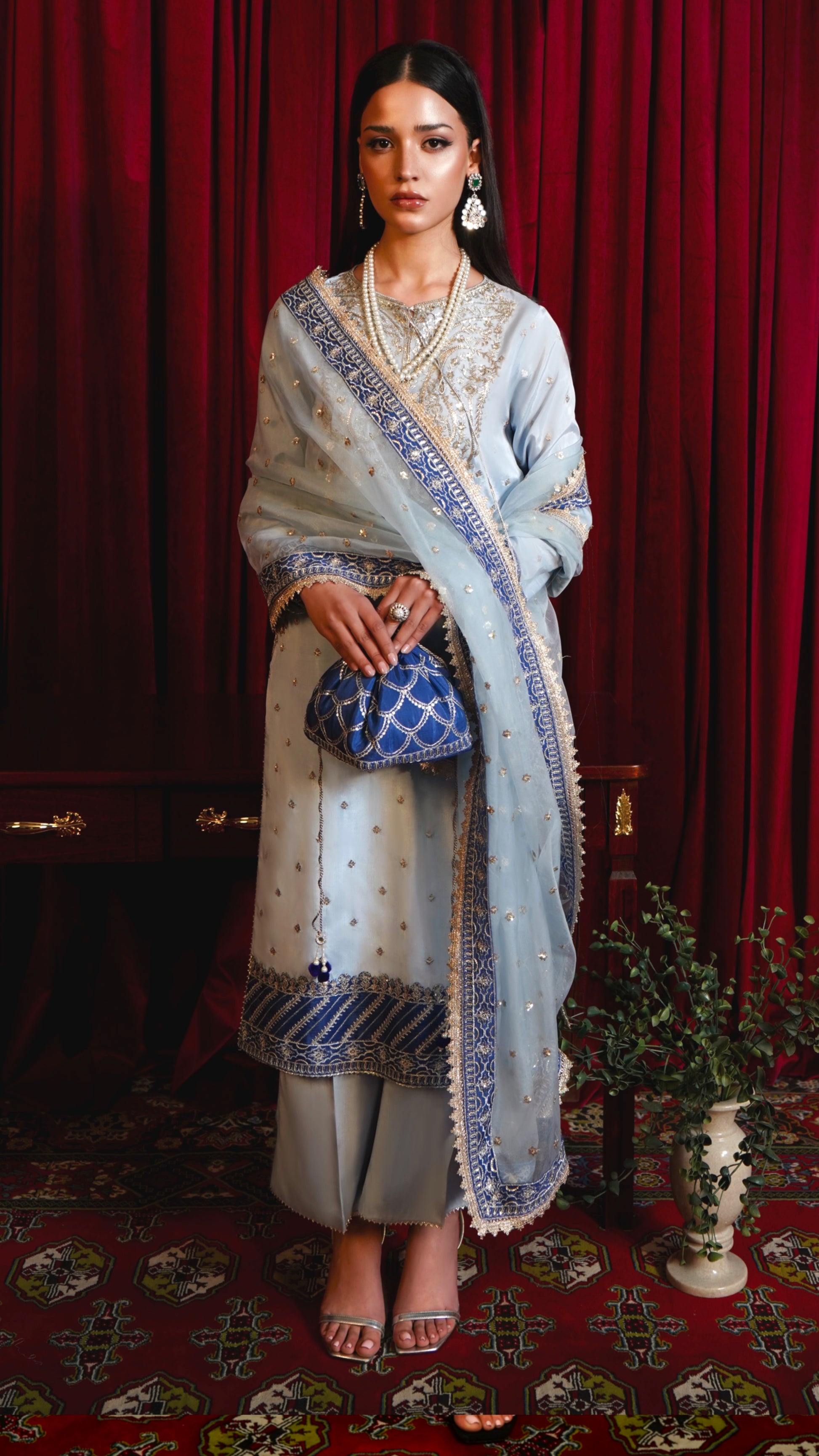 An enchanting ice blue ensemble set on a luxurious viscose silk base. Oysha is adorned with glittery silver tilla and sequin embroidery on neck, accentuated with charming tassels and a regal blue border. Complete with an organza dupatta adorned with a sequin spray and border detail, paired with chic culottes.